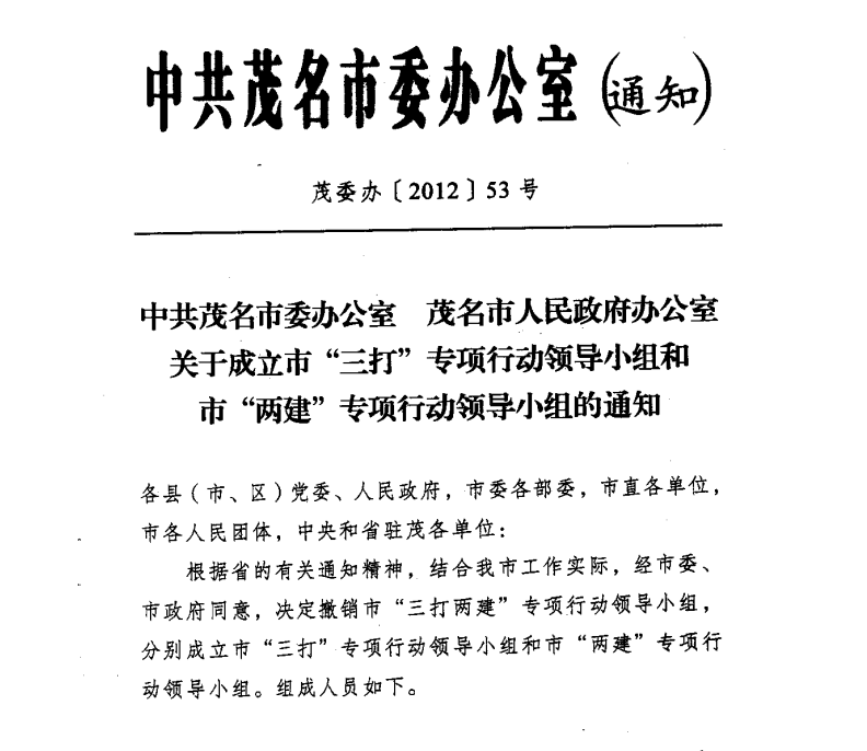 中共茂名市委办公室茂名市人民政府办公室关于成立市“三打”专项行动领导小组和市“两建”专项行动领导小组的通知茂委办[2012]53号