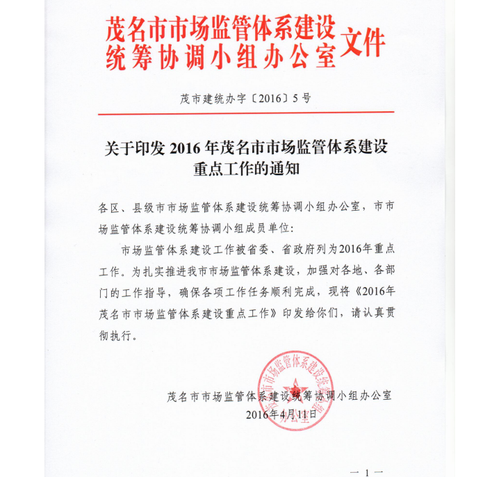 关于印发《2016年茂名市市场监管体系建设重点工作》通知