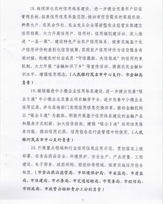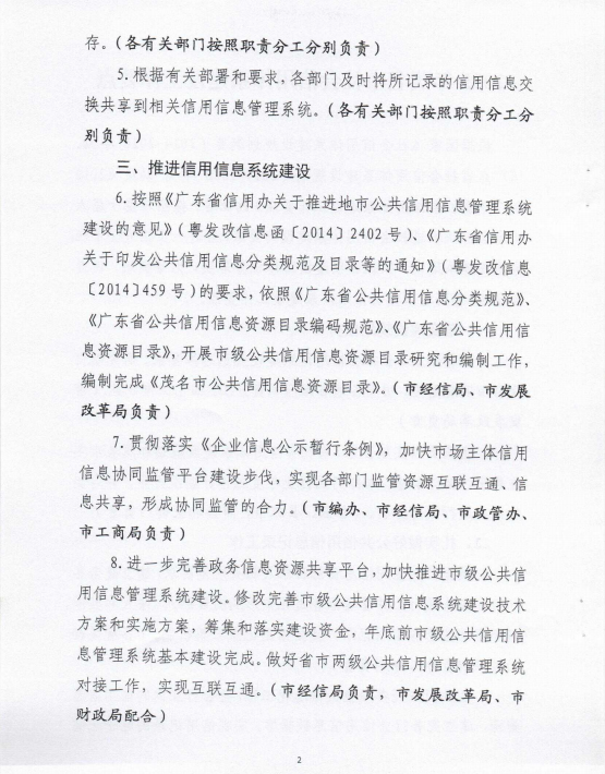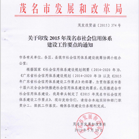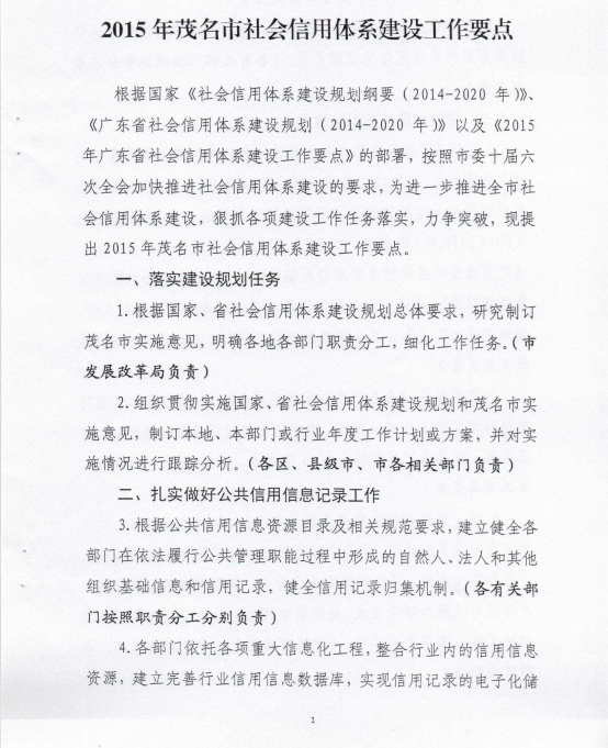 关于印发2015年茂名市社会信用体系建设工作要点的通知